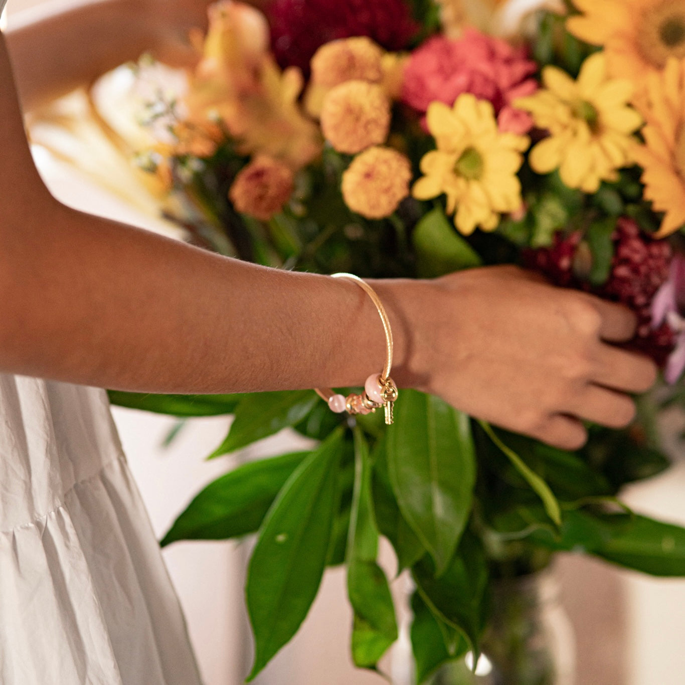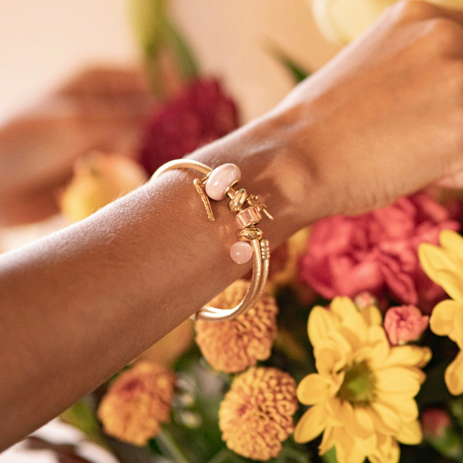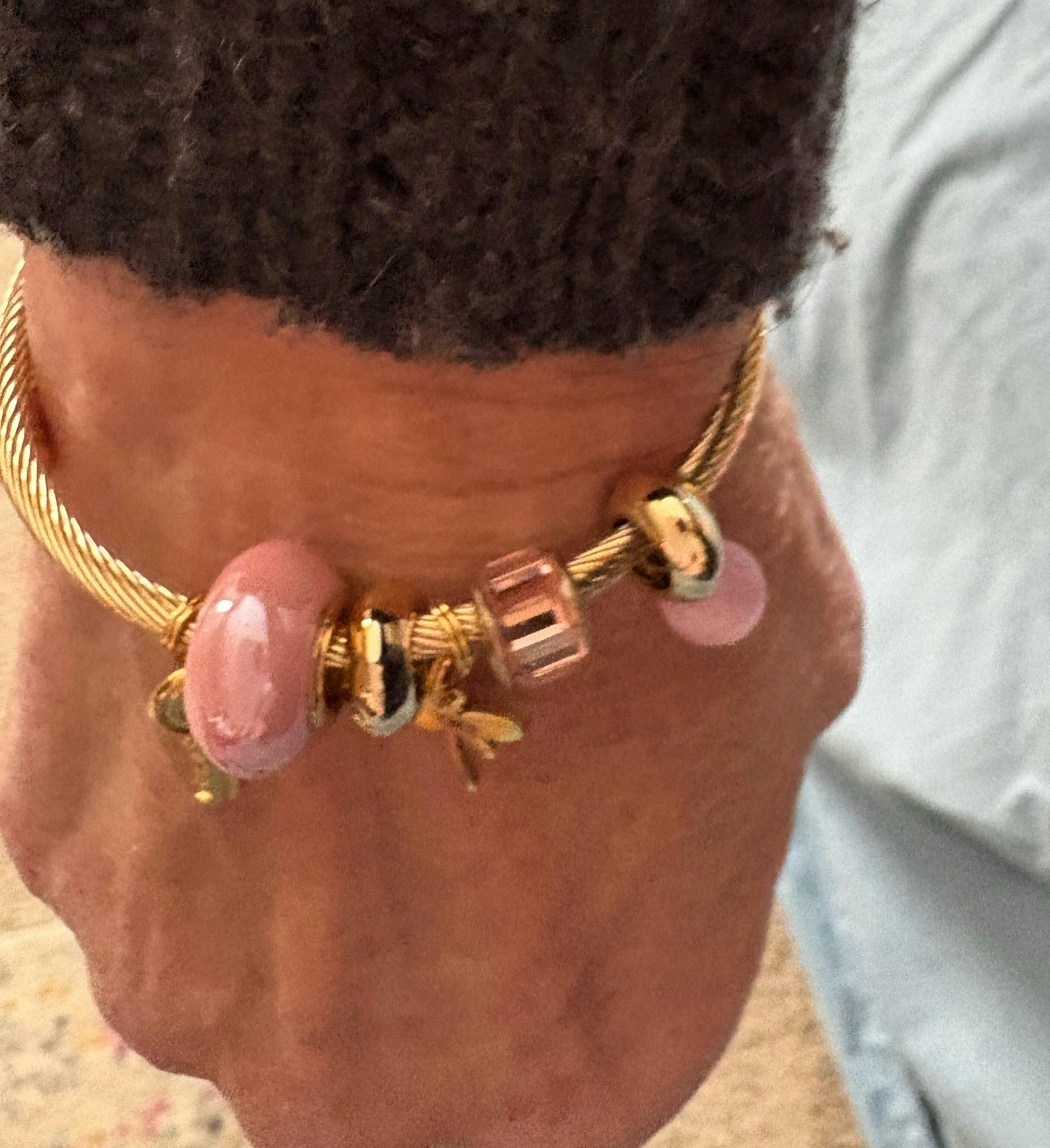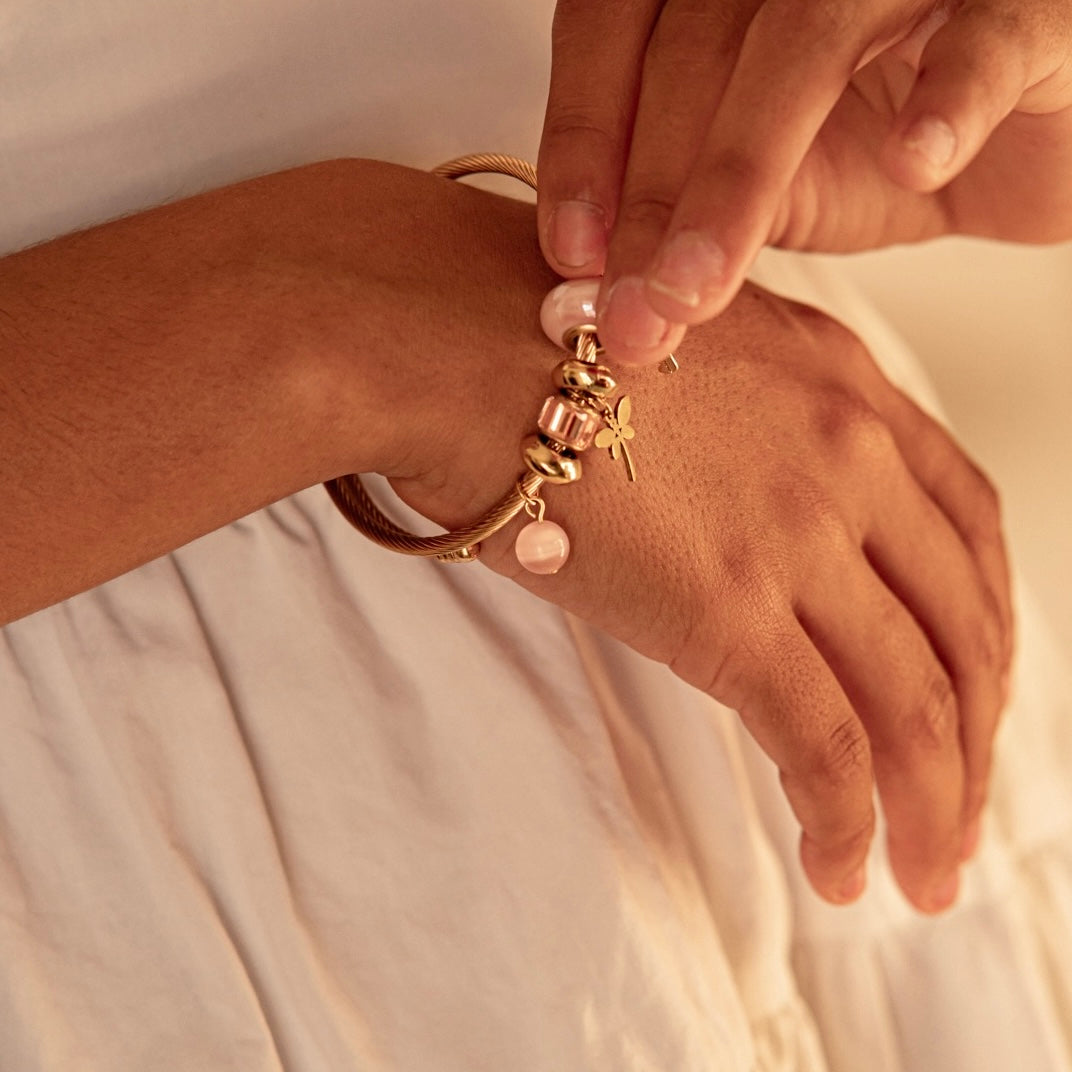 Bracelet: Gold-plated over stainless steel, adorned with a gold-plated stainless steel dragonfly charm and a gold-plated alloy mini key. Please note: while the bracelet itself is stainless steel, only the dragonfly charm is stainless steel—the other charms are not. Therefore, the bracelet is not waterproof or tarnish-proof. To preserve the finish, avoid contact with water, perfumes, and lotions. Delicately crafted for occasional wear—handle with care to maintain its shine.