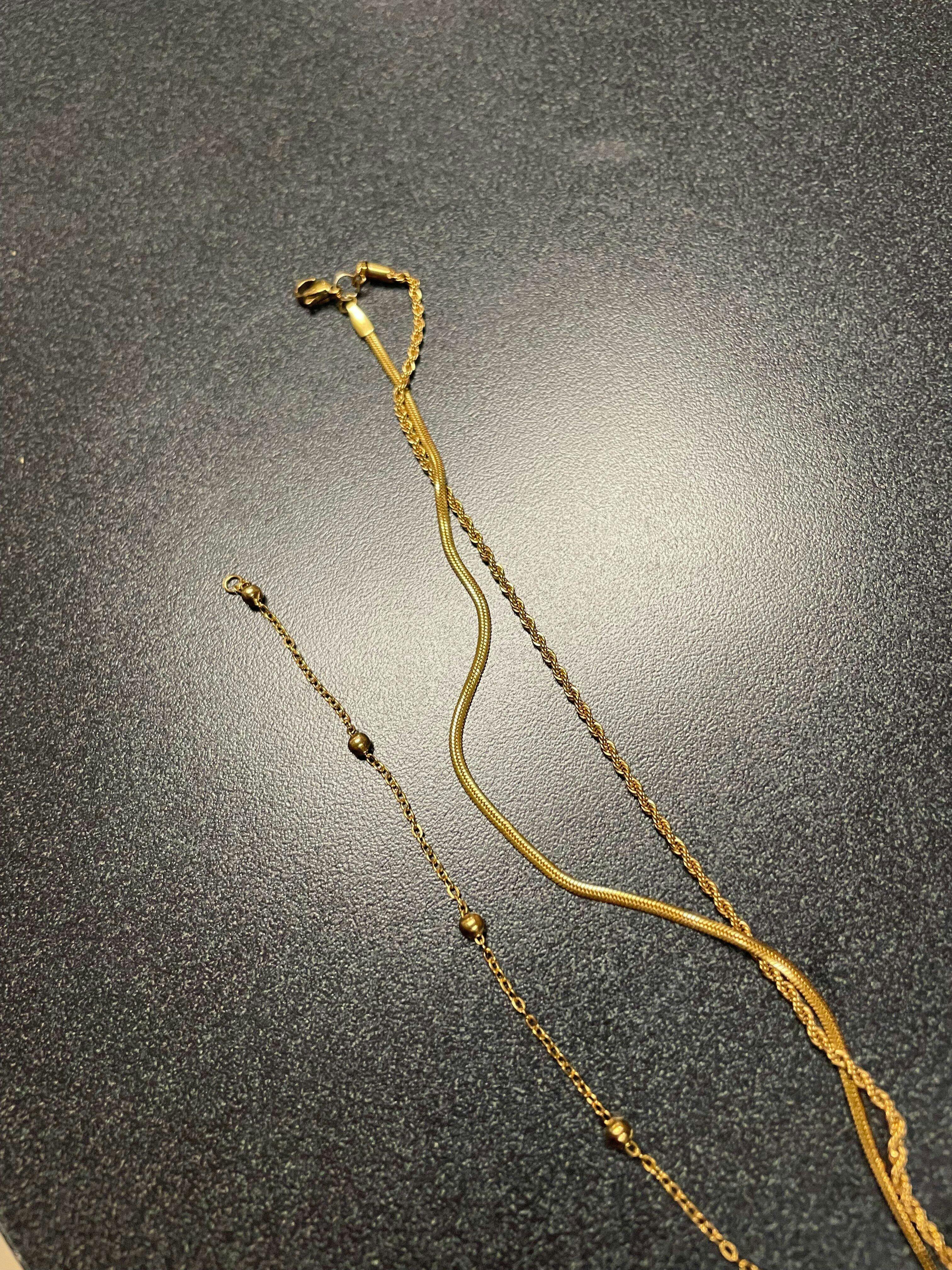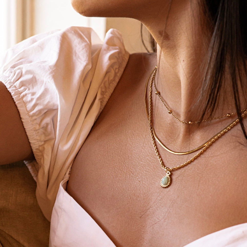 Necklace: Features three chains made of 18K gold-plated stainless steel with a stainless steel stone pendant (15x11mm) showcasing a natural Amazonite Quartz in a water drop shape.